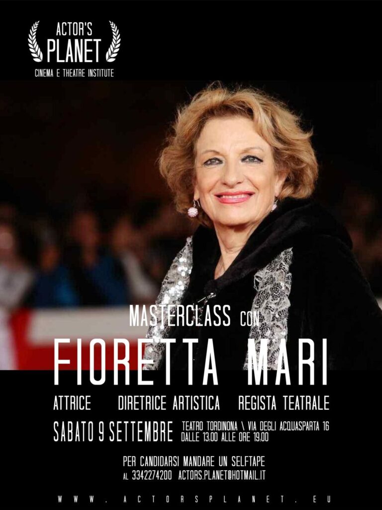 La Masterclass con Fioretta Mari è prevista per Sabato 9 Settembre presso il rinomato Teatro Tor di Nona. Un’appuntamento che cambierà la tua vita artistica ti aspetta.